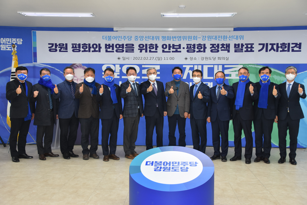 더불어민주당 중앙선대위 평화번영위원회와 강원대전환선대위가 27일 강원도당에서 기자회견을 열고 이재명 후보의 안보·평화 정책을 발표했다.
