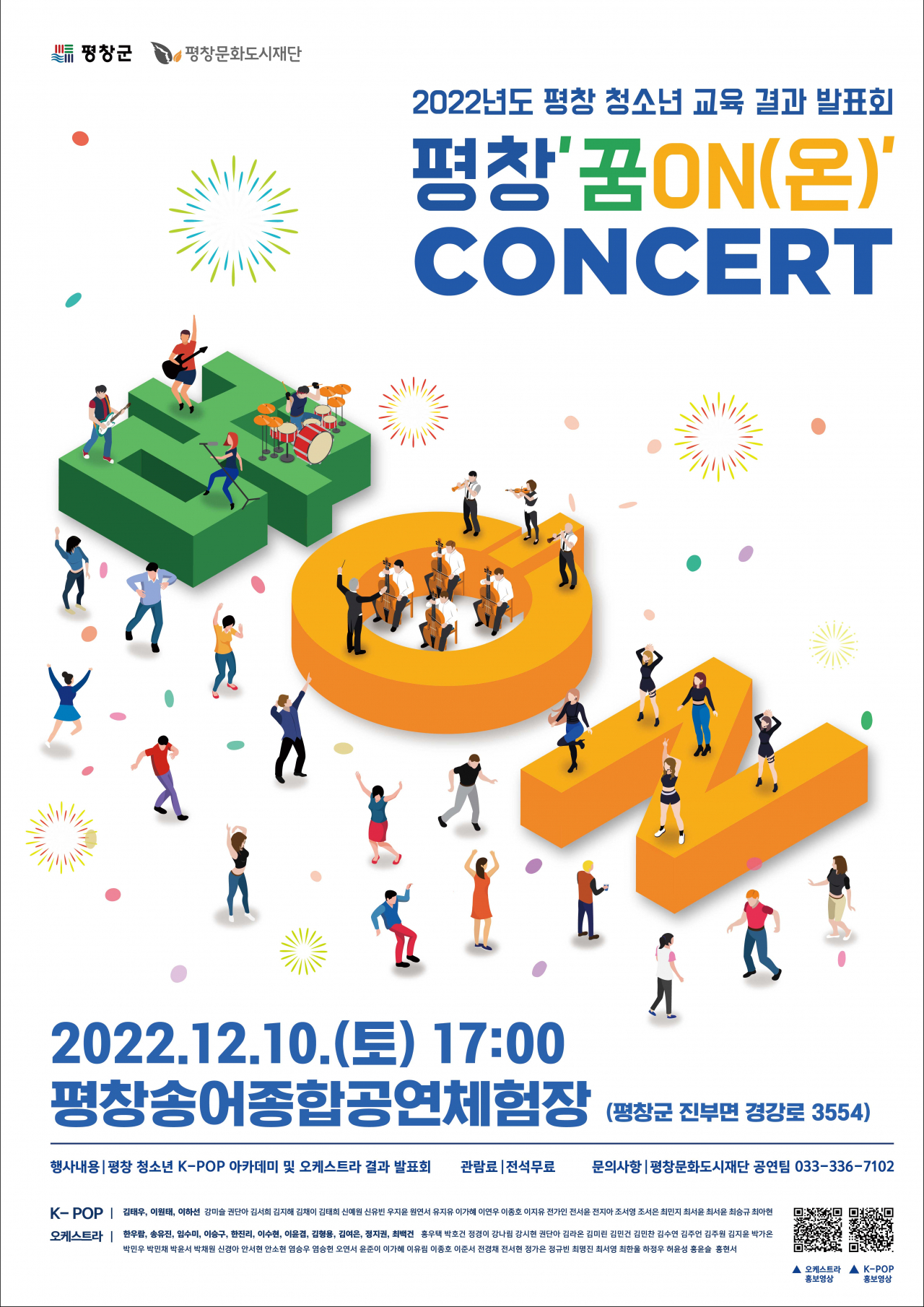 이번 콘서트는 지난 4월부터 12월까지 약 9개월 동안 진행된 ‘청소년 K-POP 아카데미’와 ‘청소년 오케스트라’ 등 평창문화도시재단의 교육프로그램의 종합결과 발표회로 청소년들에게 문화예술 활동의 기회를 제공하고, 잠재적 소질 개발을 통해 각자의 열정과 끼를 발산할 수 있는 무대로 마련된다.