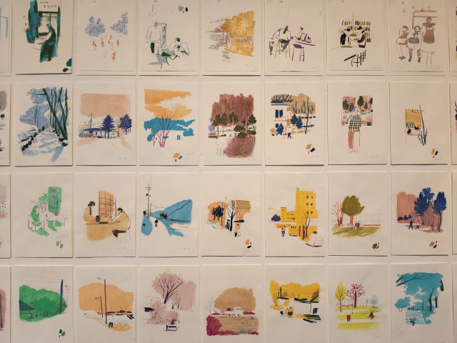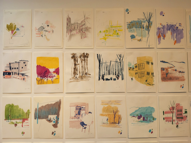 벽면 가득 걸린 100여 점의 드로잉에는 바람이 스치는 거리, 공원의 나무, 창가의 풍경 등 사소한 일상에서 발견한 빛과 여백이 담겼다. 색과 선으로 이어진 그림들은 반복된 하루 속에서도 미묘하게 변화하는 마음의 결을 보여준다. 이번 전시와 함께 선 작가는 100일간 매일 마주한 풍경과 그날의 감정이 그대로 담긴 독립출판 아트북 ‘100일의 매일’을 펴냈다.