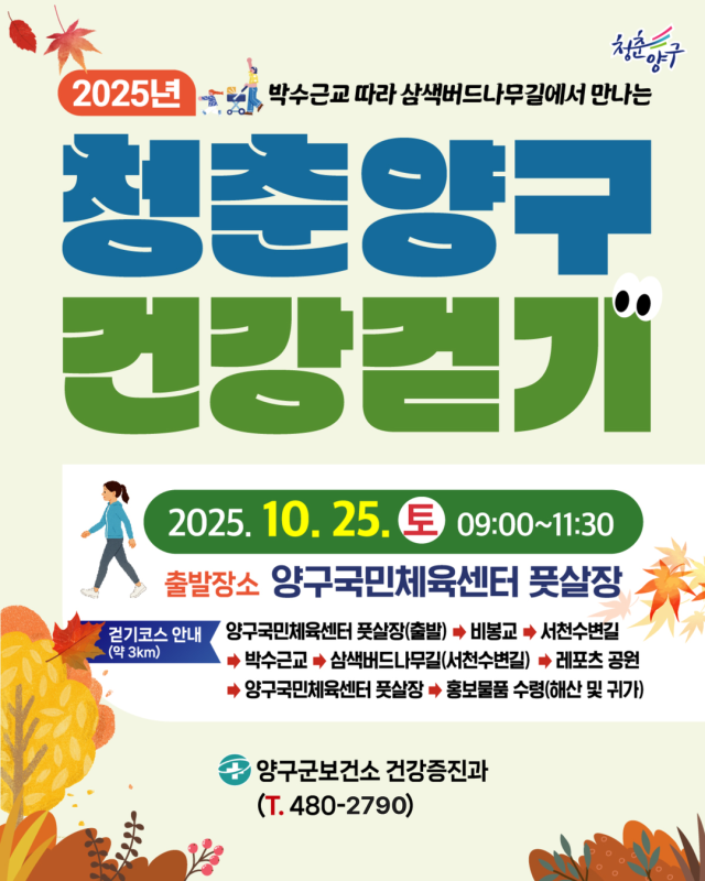 이번 행사는 통합건강증진사업과 연계해 건전한 여가문화 조성 및 지역사회 건강증진 분위기 확산을 목표로 마련됐으며, 군민들이 가을 정취 속에서 즐겁게 걸으며 건강의 소중함을 느낄 수 있도록 진행된다.