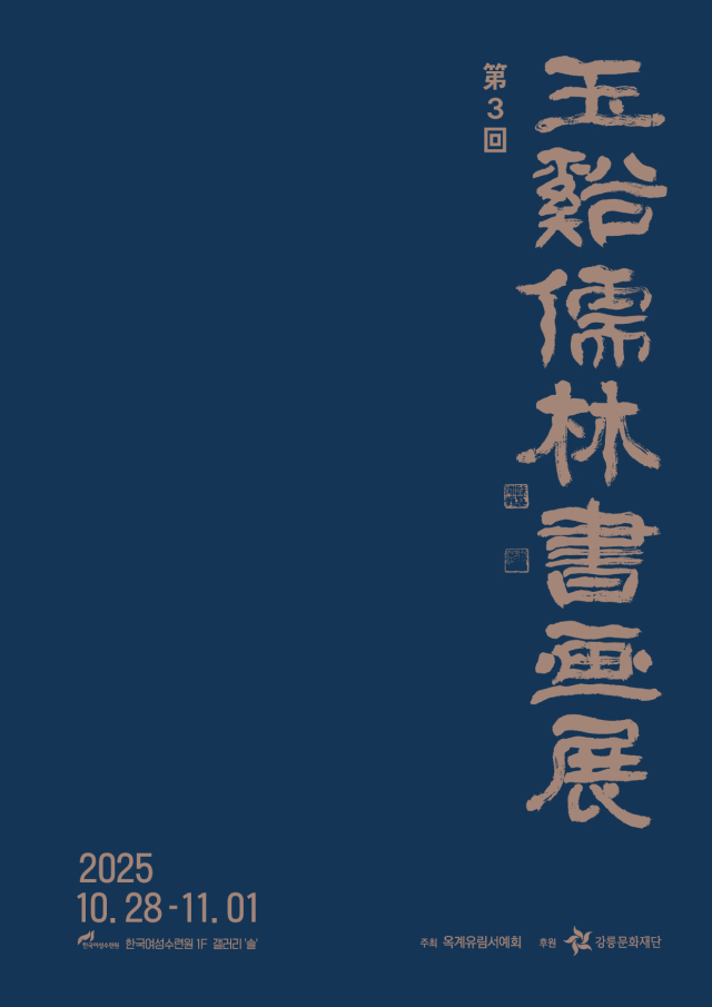 옥계유림서예회가 주최하고, 강릉문화재단이 후원하는 ‘제3회 옥계유림서화전’이 오는 28일부터 다음달 1일까지 한국여성수련원 1층 갤러리 ‘솔’에서 열린다. 이번 전시에는 옥계유림서예회 회원 16명이 참여해 한글·한문서예, 캘리그라피, 사군자 등 50여점의 작품을 선보인다. 지난 1년간 강릉 출신 서예가 동주 함영훈 작가와 정준환 지도자의 지도를 받아온 회원들의 실력을 선보이는 자리다.