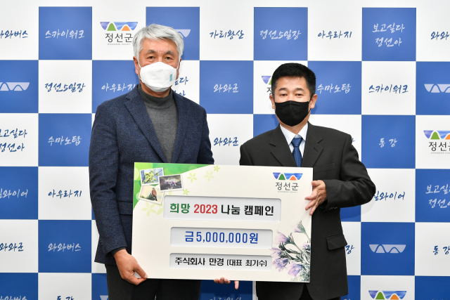 주식회사 만경(대표:최기수)은 19일 정선군청 군수 집무실에서 지역의 어려운 이웃을 위해 써달라며 희망 2023 나눔캠페인 성금 500만원을 기탁했다.