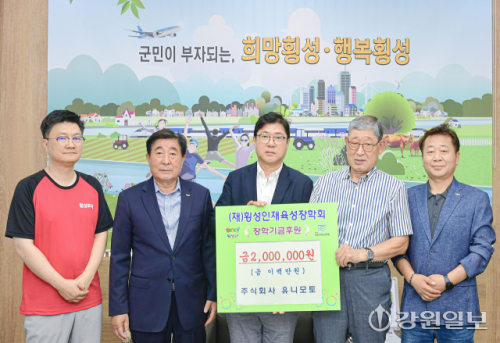 (주)유니모토 황문성 대표 일행이 지난 14일 횡성군청을 방문해 조원용 횡성인재육성장학회 조원용 상임이사에게 인재육성 장학기금 200만원을 전달했다.