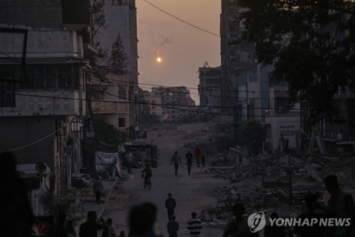 ◇9일(현지시간) 가자지구 북부 가자시티의 폐허가 된 거리 너머로 이스라엘군이 쏜 섬광탄이 보인다. 2025.10.10