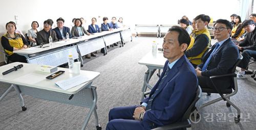 우상호 더불어민주당 도지사 후보는 28일 강릉아산병원을 찾아 노동조합(위원장:이은경) 관계자들을 만나 정책간담회를 갖고 강원지역 필수의료 체계 강화를 위한 제도 개선 방안을 논의했다. 강릉=권태명기자