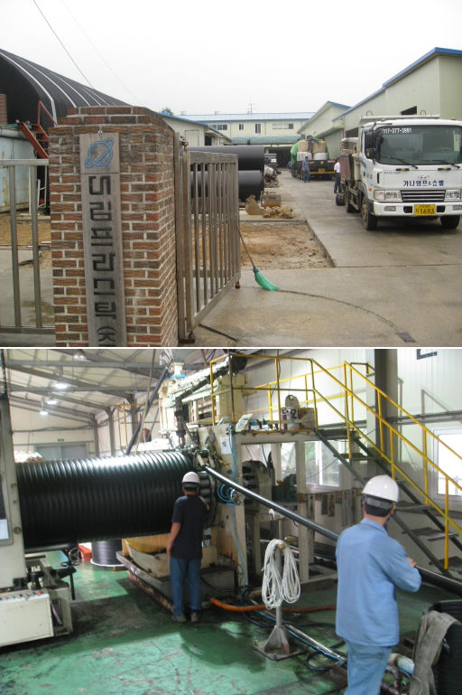 ■ 현장의 목소리를 통해 기술 개발에 주력 = 퇴계농공단지에 위치한 대림프라스틱(주) 공장에 들어서자 원료를 실은 대형 트럭들이 공장 안을 가득 메우고 있어 3,300㎡ 면적의 공장이 비좁게 느껴졌다. 공장 설비는 모두 자동화돼 있어 미리 입력된 제품 규격에 따라 원료가 사출기계 안으로 들어가자 초등학생 키만한 지름의 거대한 수도관이 만들어져 나왔다.