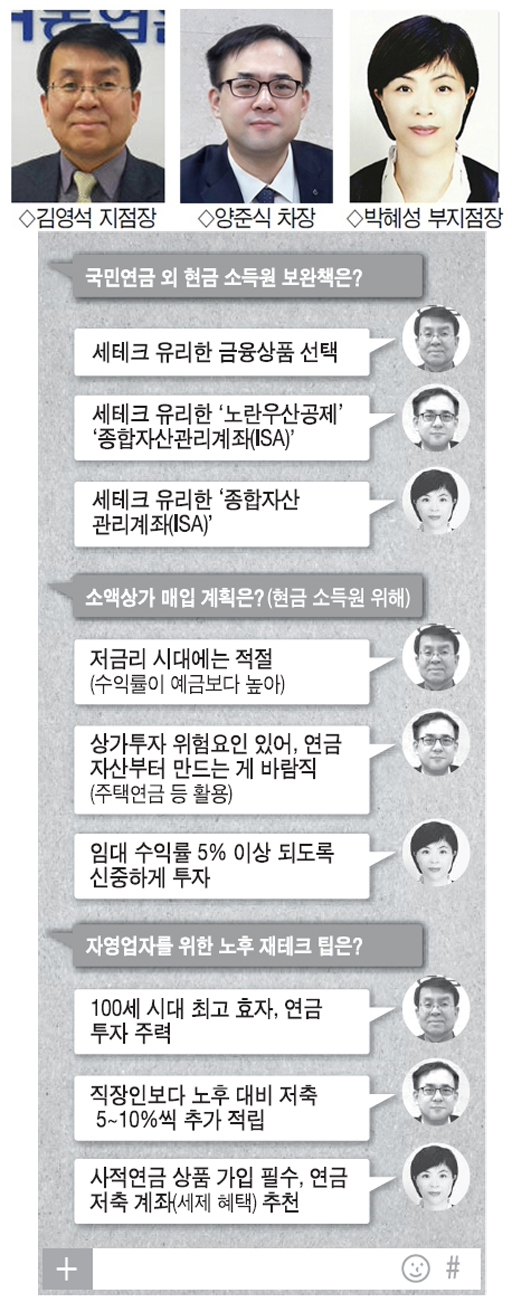 ■박혜성 KB국민은행 원주단구지점 부지점장=“우리나라의 노후 대비 국민연금 가입률은 70% 이하 입니다. 월평균 수령액이 기대 수준 대비 크게 낮은데, 사적연금 상품 가입이 필요합니다. '연금저축 계좌'를 우선 추천드립니다. 세제혜택 상품으로 가입연령 제한도 없습니다. 가입 시기는 빠를수록 좋고, 연금 수령 시기는 상담인의 근로 의욕을 고려해 70세 이후로 잡으면 적당할 듯 합니다. 1억원으로 작은 상가를 매입해 월세 소득을 구상 중이지만, 매입 가능한 상가는 제한적입니다. 상담인의 투자 성향을 고려할 때 예적금 상품이 바람직해 보입니다. 추가 이율을 받을 수 있는 상품들이 있어 꼼꼼히 확인할 것을 권합니다. 더불어 개인종합자산관리계좌(ISA)는 매년 입금할 수 있는 금액이 1,000만원으로 정해져 있으며 가입 대상은 자영업자도 소득확인 서류가 있으면 가입 가능합니다.”