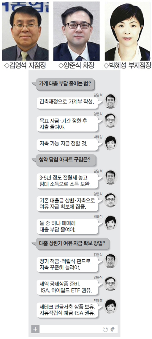 ■김영석 NH농협 춘천시청지점장=“부부의 월소득이 450만원이고, 여기서 생활비를 제외하고 100만여원을 대출금 상환에 쓴다고 가정하면, 저축을 할 수 있는 경제적 여유는 사실상 없다고 봐야 합니다. 지금부터 장기적인 시각에서 학자금을 마련해 나가기 시작해야 하는데, 긴축재정으로 가계부를 작성해 나갈 것을 권합니다. 이번에 청약이 당첨된 신축 아파트는 3~5년 정도 전월세로 놓아 임대 소득을 확보하는 방법을 통해 목돈을 마련하는 방법도 고려해볼 만합니다. 확보한 여유 자금을 활용해 정기 적금이나 적립식 펀드로 저축을 꾸준히 늘려 나가야 합니다. 자녀 교육이라는 뚜렷한 목표에 우선 집중하면서 불필요한 소비나 지출이 없는지를 잘 분석해 보세요.”