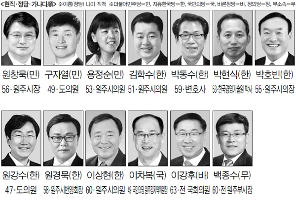 도지사 출마와 3선 시장을 놓고 고민하던 원창묵 원주시장은 3선 시장 쪽으로 무게감이 실리고 있다. 같은 당에 재선의 구자열 도의원과 3선의 용정순 시의원도 대항마로 급부상하고 있다. 자유한국당은 원경묵 원주시번영회장을 비롯해 젊은 보수를 외치고 있는 원강수 도의원, 박호빈 원주시의장, 박동수 변호사 등이 자천타천으로 물망에 오르며 치열한 경쟁을 벌이고 있다.