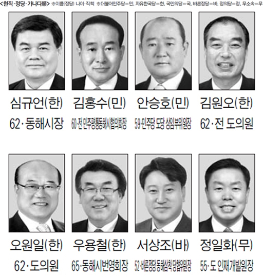 동해시는 역대 선거에서 보수 성향의 후보가 1위를 내준 적이 없다. 자유한국당은 심규언 시장이 재선을 노린다. 그는 민선 5기 김학기 동해시장의 구속 이후 시장 권한대행으로 지역 정치 무대에 등장했다. 더불어민주당은 이달 초 입당한 김홍수 전 민주평통 동해시협의회장, 안승호 도당 상임부위원장이 도전장을 낸다. 자유한국당은 최근 복당한 오원일 도의원과 김원오 전 도의원, 우용철 동해시번영회장, 바른정당은 서상조 동해·삼척 당협위원장, 무소속은 정일화 도인재개발원장 등이 거론되고 있다. 지금까지의 역대 지선 중 재선에 성공한 동해시장은 재임 중 구속되는 좋지 않은 선례가 있다. 재선 도전에 나선 현 시장에 대한 표심이 어떻게 작용할지 주목된다.