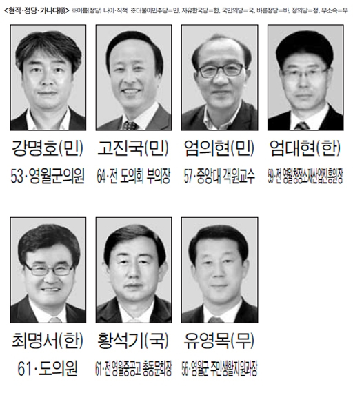 영월은 3선인 박선규 군수가 내년 지방선거에 출마하지 못함에 따라 자천타천 후보들이 난립하는 등 벌써부터 경쟁이 치열하다. 영월군수 선거는 1995년 민선 시대 개막 후 6기 동안 모두 공무원 출신이 당선됐다. 지역적으로 보수 성향의 표심이 강한 것이 특징이다. 내년 지선에서는 정당 공천 여부와 함께 지연 혈연 학연과 인물론 등이 승부의 변수가 될 전망이다. 더불어민주당은 강명호(53) 영월군의원, 고진국(64) 전 도의회 부의장, 엄의현(57) 중앙대 객원교수가, 자유한국당은 최명서(61) 도의원과 엄대현(59) 전 영월청정소재산업진흥원장이, 국민의당은 황석기(61) 전 영월중공고 총동문회장, 무소속은 유영목(56) 영월군 주민생활지원과장 등이 거론되고 있다.