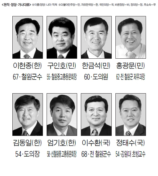 내년 철원군수 선거의 핵심 키워드는 각 정당의 공천경쟁이다. 자천타천 8명이 후보군을 이루며 정중동의 움직임을 보이고 있다. 자유한국당은 재선에 도전하는 이현종 현 군수와 김동일 도의회 의장, 엄기호 법무사의 물밑 경쟁이 치열하다. 더불어민주당은 구인호 철원중·고총동문회장, 한금석 도의원, 홍광문 도당 부위원장이 경쟁하고 있다. 국민의당은 이수환 전 군수와 정태수 전 안철수 대선 후보 도당공동선대위 위원장이 경쟁하고 있다. 철원군수 선거전은 20여 년간 이어진 철원·동송권, 갈말권, 김화권 등 3개 권역별 소지역주의 바람도 중요한 변수다. 1995년 이후 민선 시대 역대 군수는 대부분 여당 성향의 권역별 단일 후보가 당선됐다.