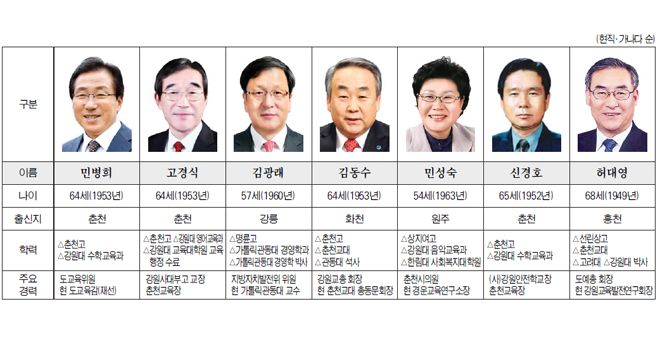민 교육감 외의 자천타천 후보군은 6명 정도다. 이 가운데 신경호 전 (사)강원안전학교장이 가장 왕성한 활동을 보이고 있다. 그는 “출마할 생각으로 활동을 하고 있다. 강원인재 육성을 가장 큰 목표로 삼아 강원교육 발전을 위해 최선을 다하겠다”고 밝혔다. 민성숙 경운교육연구소장도 '건강한 진보'를 내세우며 적극적으로 움직이고 있다. 민 소장은 “진보와 보수의 좋은 점을 수용해 교사와 학생의 소통이 이뤄지는 교육현장을 만들어 가기 위해 출마를 결심했다”고 말했다.