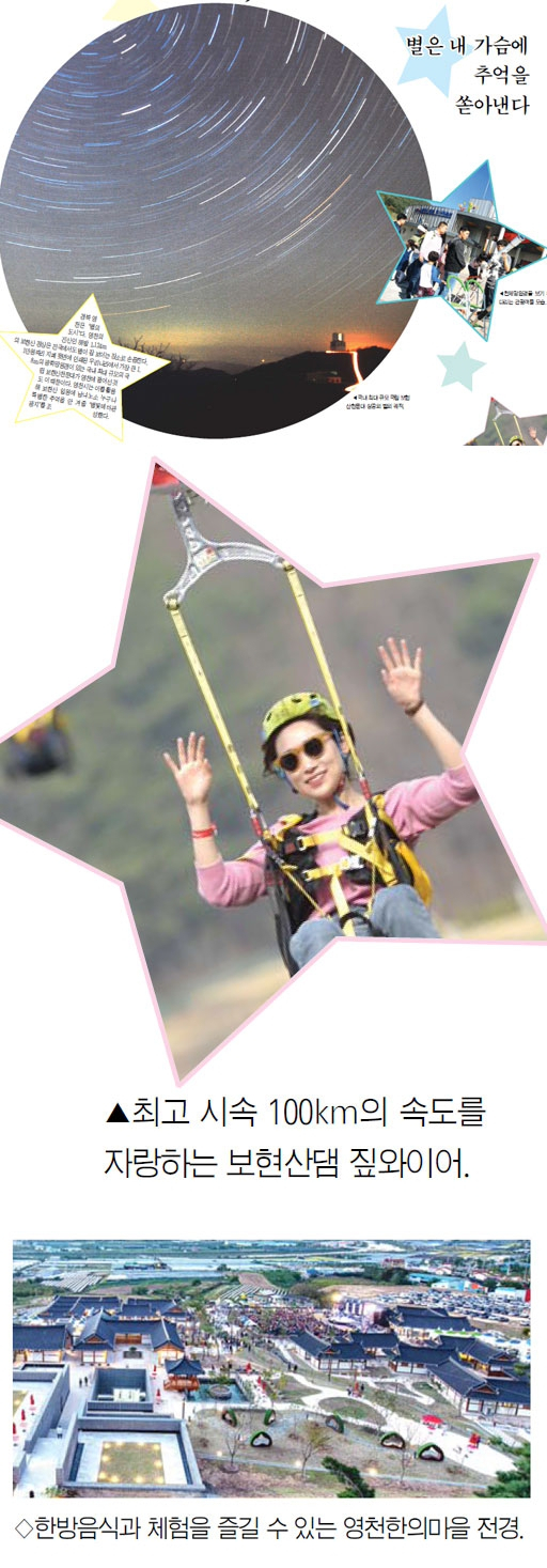 경북 영천은 '별의 도시'다. 영천의 진산인 해발 1,124m의 보현산 정상은 전국에서도 별이 잘 보이는 장소로 손꼽힌다. 1만원짜리 지폐 뒷면에 인쇄된 우리나라에서 가장 큰 1.8m의 광학망원경이 있는 국내 최대 규모의 국립 보현산천문대가 영천에 들어선 것도 이 때문이다. 영천시는 이를 활용해 보현산 일원에 남녀노소 누구나 특별한 추억을 안겨줄 '별빛테마관광지'를 조성했다.