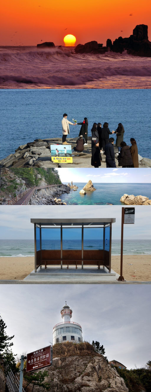 ■BTS 흔적있는 강릉 주문진=강릉 주문진 바닷가에는 방탄소년단의 앨범 재킷 사진에 등장한 바닷가 버스정류장이 있다. 일명 BTS 버스정류장. 팬클럽 '아미'가 아니더라도 이곳을 찾는 관광객이면 한번쯤 찾아가는 이색 볼거리로 자리잡았다. 주문진에서 남쪽으로 발길을 돌리면 길이 600m의 고즈넉한 영진해변이 있다. 탁 트인 전망과 호젓한 분위기의 해안가를 따라 카페가 자리해 하루종일 바다를 바라보기 안성맞춤이다. 드라마 '도깨비' 촬영지로도 유명하다. 강동면 심곡항에서 금진항으로 이어지는 '헌화로'도 바다와 가장 가까운 도로로 유명하다. 기암절벽과, 볼 때마다 다른 빛깔을 드러내는 바다의 매력에 흠뻑 빠질 수 있다. 정동진 썬크루즈 주차장에서 심곡항에 이르는 2.9㎞의 바다부채길은 2,300만년 전인 신생대 제3기 말~제4기 초에 일어난 지반 융기작용으로 형성된 해안단구(천연기념물)와 수평선을 바라보며 걷기 좋다.