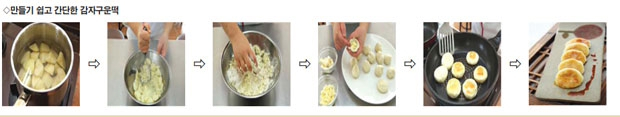 우선 감자는 썰어서 소금을 약간 넣고 삶아 으깬다. 그 뒤에 버터, 소금, 감자가루, 찹쌀가루, 설탕, 우유를 넣고 반죽한다. 그리고 나서 45g씩 분할된 반죽에 소를 넣어 둥글납작하게 빚는다. 마지막으로 팬에 기름을 두르고 앞뒤로 노릇하게 구워준 후 센 불에서 빠르게 졸인 소스를 끼얹으면 완성. 감자떡을 구울 때 같이 넣어서 재빨리 졸이는 것이 도농업기술원 대표음식팀이 자랑하는 비밀스런 '킥'이다.