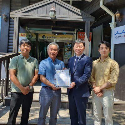 춘천 신북읍을 닭갈비촌(村)으로 만든 일등공신인 31년 역사의 '(주)통나무집 닭갈비'가 2일 백년가게 현판을 달았다. 중소벤처기업부가 소상공인들에게 롤모델이 될 만한 지역 대표 업체를 발굴해 수여하는 '훈장' 같은 현판이다. 이날 오전 강원지방중소벤처기업청이 마련한 수여식에는 창업자인 김형우(67) 회장과 가업을 승계받은 장남 김성철(39), 차남 김성인(38) 공동대표도 참석했다.
