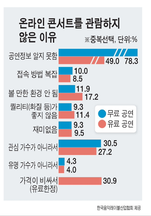 오프라인 공연 관객이 온라인 공연을 관람하지 않은 가장 큰 이유는 '공연 정보를 알지 못해서'로 조사됐다. 한국음악레이블산업협회가 3년 내 유료 오프라인 공연을 관람한 전국 만16~49세 1,000명을 대상으로 조사한 '온라인 공연 선호도 조사' 결과다.