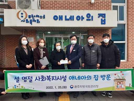 원주지방국토관리청(청장:박일하)은 설을 맞아 27일 원주 장애인 복지시설인 ‘애네아의 집’을 찾아 위문품을 전달했다.