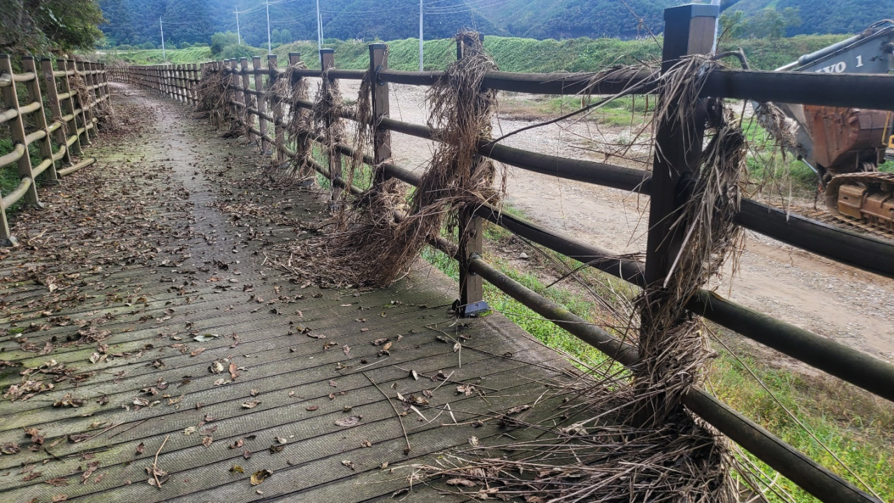 이곳 데크길은 지난 8월 기록적인 폭우가 내리면서 바로 옆 섬강의 물이 범람해 잠기는 피해를 입었다. 당시 강에서 쓸려 내려온 수풀과 나무들이 난간에 걸렸고, 물이 빠지자 이 같은 모습으로 2개월간 방치된 것이다.