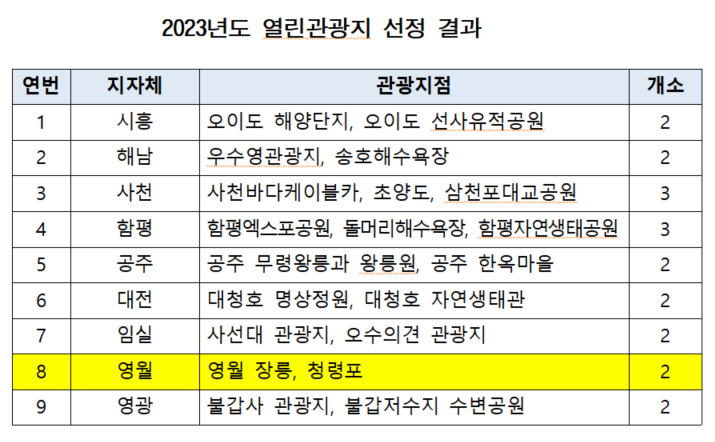 영월의 장릉과 청령포가 ‘2023년 열린관광지’에 선정됐다. 문화체육관광부(이하 문체부)는 영월 장릉과 청령포를 비롯해 전국 9개 관광권역의 관광지 20곳을 ‘2023년 열린관광지 조성 사업’ 지원 대상에 최종 결정됐다고 29일 밝혔다. ‘열린관광지 조성 사업’ 은 장애인, 고령자 등 관광 약자의 관광지 내 이동 불편을 해소하고, 무장애 관광 정보 제공, 무장애 인식 개선 교육 등을 통해 전 국민의 관광 활동 여건을 쉽고 편리하게 만드는 사업이다. 영월 장릉은 어린 나이에 세조에게 왕위를 빼앗긴 조선 6대 왕 단종(재위 1452~1455)의 무덤으로, 1970년 사적으로 지정된 곳이고, 영월 청령포는 암벽과 강으로 둘러싸인 단종의 유배지로 2008년 명승으로 지정됐다.