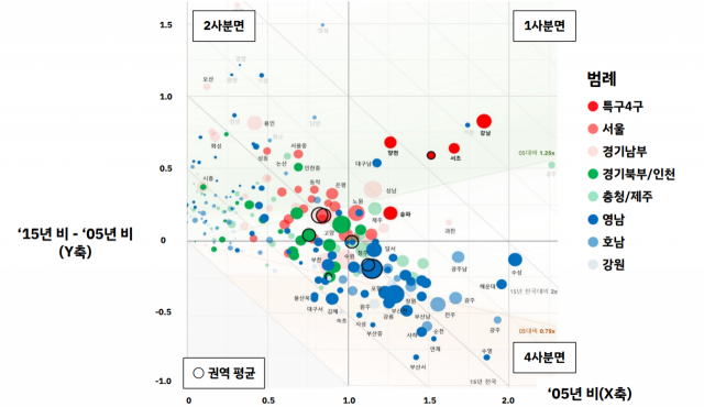 또, 영남, 호남, 충청 등 강원자치도와 사회경제적 환경이 비슷한 비수도권 각 지역에서도 지난 10여년간 불평등으로 인한 격차가 심화되고 있는 것으로 나타났다. 영남과 호남의 경우 도와 함께 대표적으로 불평등이 악화된 지역으로 꼽혔으며, 전라북도 순천의 경우 2005년 전국 평균 대비 1등급 수험생 비가 1.46이었으나 2015년에는 0.85로 감소했다. 감소율은 무려 42%다. 충청권역의 대표적인 도시인 충주는 전국 평균 대비 1등급 학생의 비가 2005년 1.27에서 2015년 0.86까지 감소, 32%의 감소율을 보였고, 높은 교육열로 알려진 영남권역 대표 도시 포항에서조차 그 값이 2005년 1.2에서 2015년 0.83으로 감소했다. 감소율은 31%에 이르렀다. 지역 유형별로는 강남에서 2005년 대비 2015년에 1·2등급 학생 비가 40% 증가한 반면 비수도권 소형 지방자치단체에서는 20% 감소했다.