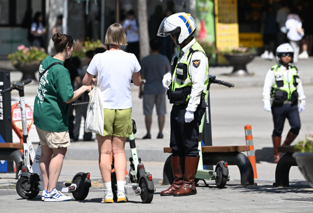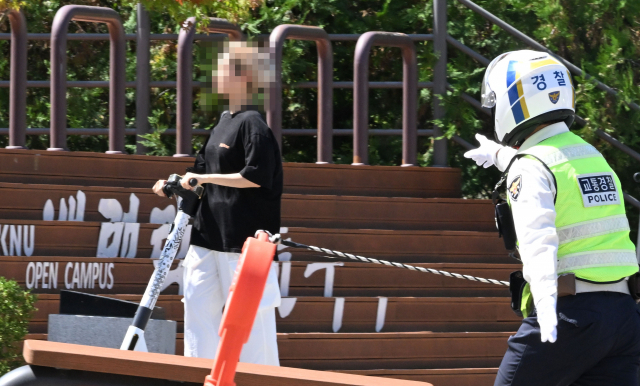 2학기 개강을 맞이한 지난 6일 춘천 강원대 후문. 오후 1시에 시작되는 강의 출석에 늦지 않기 위해 전동킥보드로 등교에 나선 학생들을 대상으로 강원대 ‘상상’ 총학생회와 춘천경찰서가 함께 단속에 나섰다.