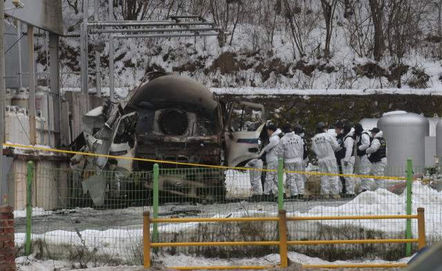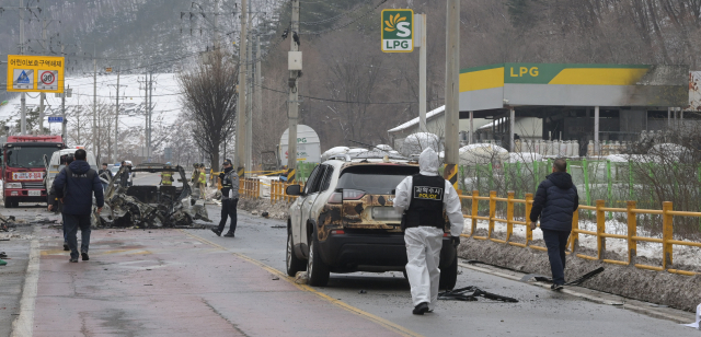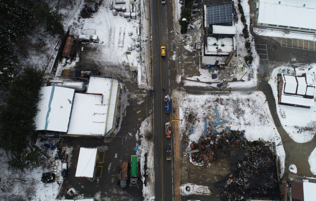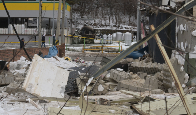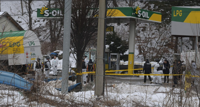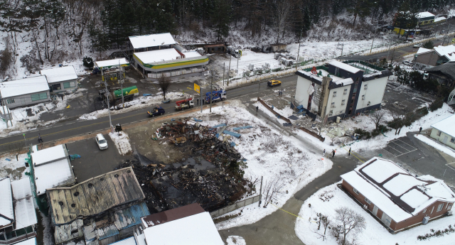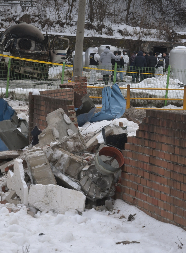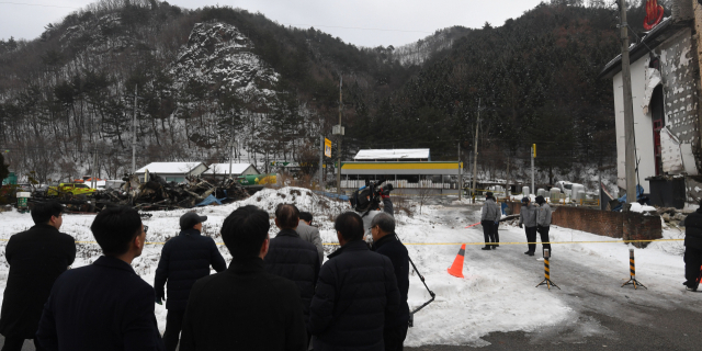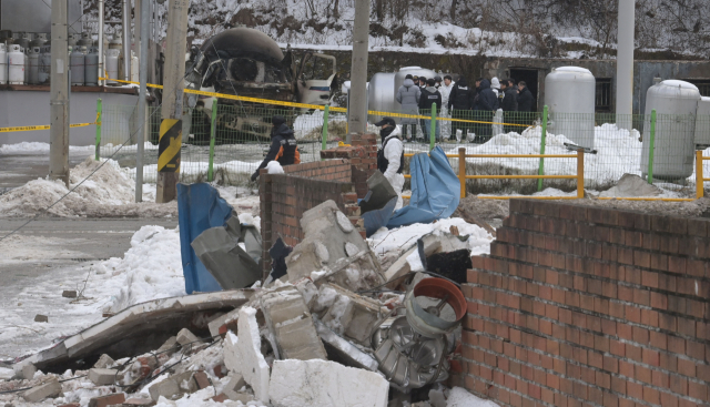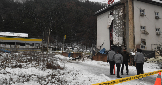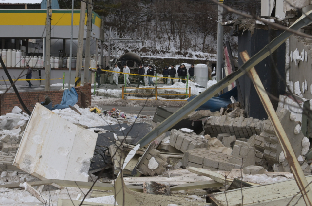 지난 1일 평창군 용평면 장평리 액화석유가스(LPG) 충전소에서 발생한 가스 폭발 사고로 반경 300m 구간의 마을이 초토화된 가운데 2일 사고 현장에서 경찰과 소방 당국, 국립과학수사연구원, 가스안전공사 등 관계자들이 합동 감식을 진행하고 있다. 평창=권태명기자
