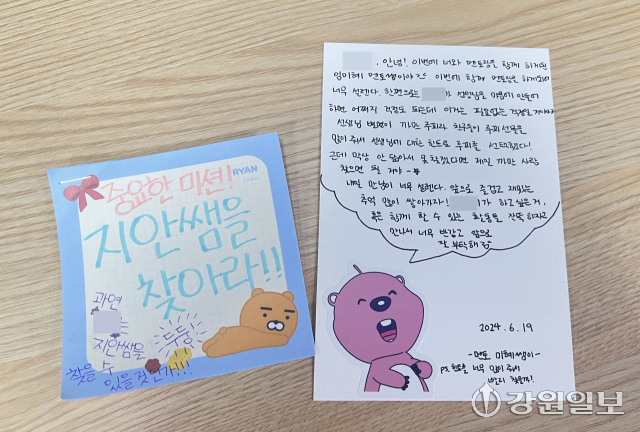 지난 20일, 오후 6시 20분. 강원특별자치도아동보호전문기관 3층 회의실 앞 책상 위에는 작은 쪽지들이 놓여 있었다. 20대부터 50대 등 다양한 연령대의 사람들이 두고 간 편지는 회의실 안에 앉아 있는 아동 5명에게 전달 됐다. 아이들은 ‘만나서 반가워’ 초대장과 함께 자신에게 전달된 편지를 읽으며, 편지를 쓴 사람이 누구인지 추측하는 시간을 가졌다. 강원도아동보호전문기관은 올해부터 처음으로 학대 피해 아동과 성인 멘토가 모두 한 자리에 모이는 ‘내가 그린 멘토링’을 마련했다. 이날은 5명의 학대 피해 아동과 5명의 멘토가 처음으로 만나는 자리로 꾸며졌다. 떨리는 멘토들 사이에서 제각기 편지 속 멘토를 예상하던 중, 한 아이가 “왠지 저 남자 분이실 거 같아요”라며 운을 떼자, 아동들은 자신이 생각한 이유와 함께 멘토를 맞추기 바빴다. 준비된 1대1 매칭이 모두 끝나자 멘토와 멘티는 나란히 앉아 인사를 나누고는 함께 멘토·멘티 서약서를 작성했다.