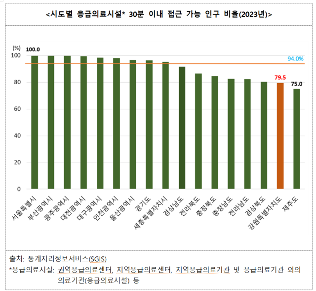 26일 강원지방통계지청이 발표한 ‘2023년 강원지역 생활SOC 접근성 분석’에 따르면 30분 이내에 응급의료시설에 접근할 수 있는 강원자치도민의 비율은 79.5%로 전국에서 제주도 다음으로 가장 낮았다. 99.3%가 30분 이내에 응급의료시설을 접근할 수 있는 서울 등 8개 특별시·광역시와 비교하면 무려 20%나 떨어진다. 응급의료시설 접근성을 거리로 환산하면 서울이 2.94km로 가장 짧았고, 강원(22.32km)이 제주(22.29km)와 함께 가장 멀었다. 결국 강원자치도가 응급의료에 가장 취약한 지역인 셈이다.