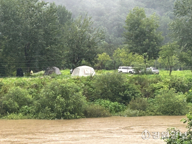 강원지역 전역에 쏟아진 장맛비로 강과 계곡 등 하천의 수위가 오르며 사고위험이 높아지고 있다. 당국이 인명피해를 막기 위해 하천 출입을 통제하고 있지만 하천변 곳곳에 텐트를 친 ‘우중 캠핑족’들이 자리를 차지하고 있는 등 안전불감증이 심각한 것으로 드러났다.