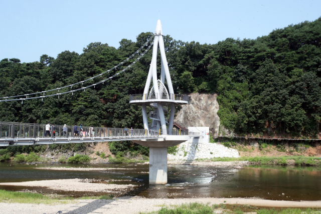 【홍천】 홍천읍과 북방면을 연결하는 현수교(출렁다리)인 송학정교가 13일 개통 됐다. 도심이 확장 될 뿐만 아니라 홍천강 위를 걸을 수 있는 새로운 랜드마크가 될 전망이다.