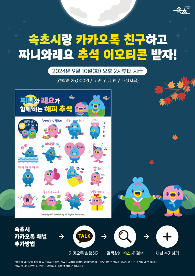 이모티콘은 카카오톡을 통해 내려받을 수 있으며, 추석 인사를 비롯한 ‘맛있으면 0칼로리’, ‘운동하자’, ‘안녕’, ‘죄송합니다’ 표현 등 일상에서 자주 사용할 수 있는 16개 표현과 상황의 이모티콘으로 구성해 재미와 활용성을 높였다. 이모티콘을 받으려면 카카오톡 검색창에 ‘속초시’를 입력해 속초시 채널을 추가하면 된다.
