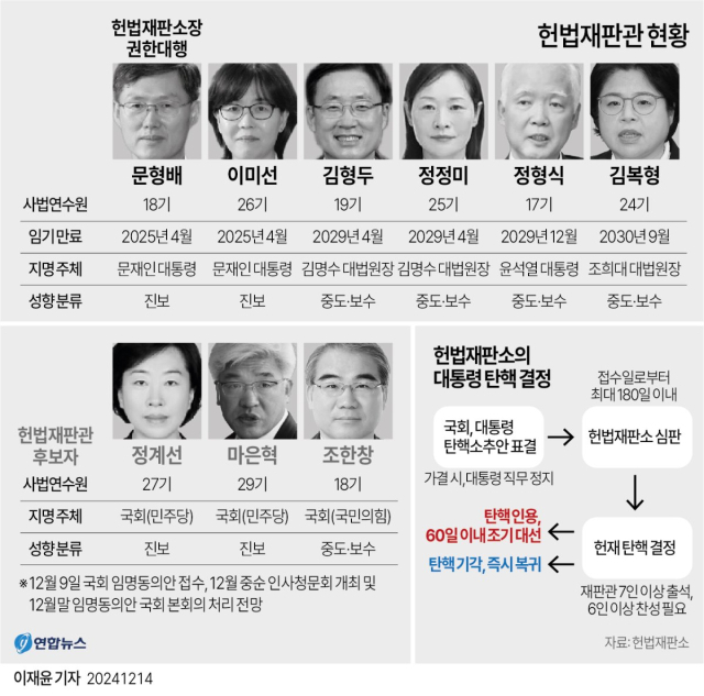 현재 헌법재판소 재판관은 전체 9명에서 3명이 모자란 '6인 체제'이다. 국회는 여야 몫의 후보자 3명의 추천을 완료했으며 인사청문회 개최 절차에 들어간 상태다. 새로 추천된 후보는 조한창(59·사법연수원 18기·국민의힘 추천) 변호사를 비롯해 양양 출신의 정계선(55·27기·민주당 추천) 서울서부지법장, 고성 출신의 마은혁(61·29기·민주당 추천) 서울서부지법 부장판사다.