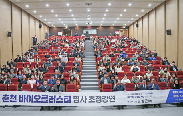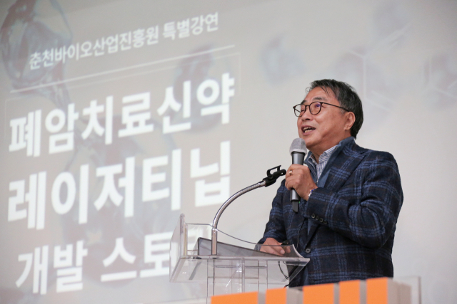 국산 항암제 최초로 미국 식품의약국(FDA) 승인을 받은 비소세포폐암치료제의 원기술을 개발한 춘천 출신 김정근 (주)오스코텍 대표가 16일 춘천시청에서 특강을 했다.