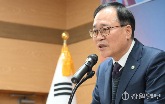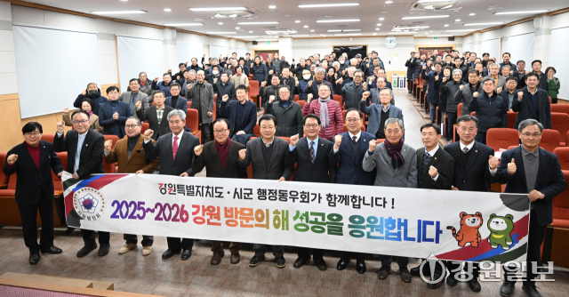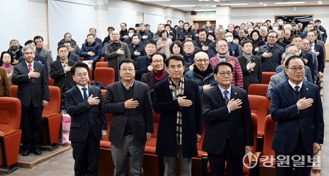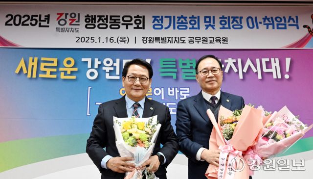 2025년 강원 행정동우회 정기총회 및 회장 이·취임식이 16일 강원자치도 공무원교육원에서 오춘석 신임회장, 이우식 전임회장, 김진태 지사, 육동한 춘천시장, 김길수 도의회 예산결산특별위원장, 김왕규 도의원, 김진선 전 지사를 비롯한 내빈과 회원들이 참석한 가운데 열렸다.