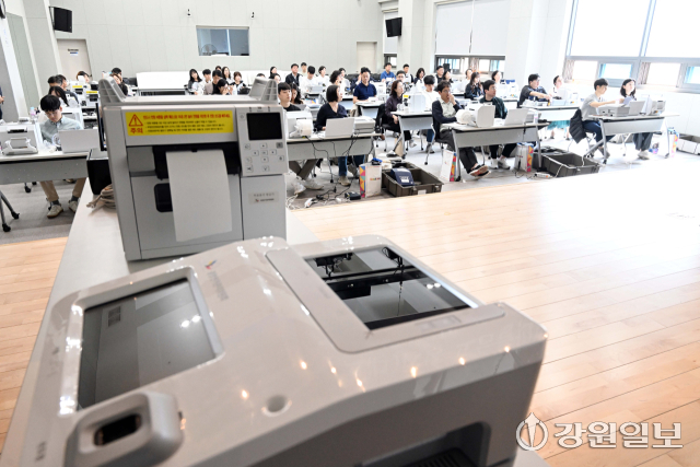 제21대 대통령 선거 사전투표를 2주 앞둔 15일 북춘천새마을금고 본점에서 춘천시선거관리위원회 주최 사전투표관리관 및 장비담당사무원 교육이 열렸다.
