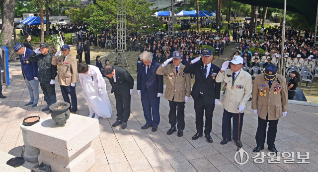 강릉시 ‘제70회 현충일 추념행사’가 6일 경포대 충혼탑에서 김홍규 강릉시장, 최익순 시의장, 최윤정 강원동부보훈지청장, 김헌중 공군 제18전투비행단장을 비롯한, 기관 단체장 및 보훈단체장, 국가유공자 유족, 관내 초중고 학생 및 대학생, 시민 등 1,000여 명이 참석한 가운데 열렸다. 강릉=권태명기자