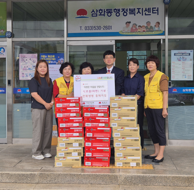 한화생명 금융서비스 동해지점(지점장:지종탁)은 최근 오선애 삼화동 지역사회보장협의체 위원의 추천을 삼화동행정복지센터를 방문, 라면 2종 20박스를 어려운 이웃들에게 전달해 달라며 기탁했다.