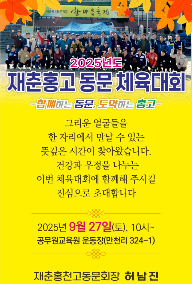 춘천에 거주하는 홍천고등학교 동문들의 화합과 우정을 다지는 '2025년도 재춘 홍천고등학교 동문 체육대회'가 오는 27일 오전 10시 강원특별자치도공무원교육원에서 열린다.
