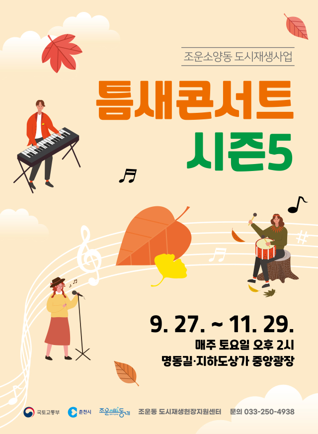 올해로 5회를 맞은 틈새콘서트는 조운·소양동 도시재생사업의 일환으로 시작돼 원도심의 거리를 무대로 예술가와 시민이 함께하는 문화 프로그램으로 자리매김했다. 이번 시즌 주제는 ‘가을 연가’로, 가을 정취를 살린 음악과 퍼포먼스가 관람객에게 낭만과 위로를 전할 계획이다.