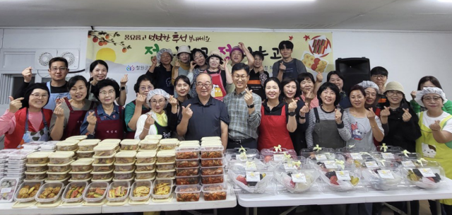 【철원】철원군지역사회보장협의체와 철원군자원봉사센터, 철원군청 희망복지지원단이 23일 지역 내 복지사각지대에 놓인 취약계층을 위한 '전 나누고 정 나누고' 명절 음식 나누기 행사를 실시했다. 이번 봉사활동에 참여한 봉사자들은 명절 음식을 만들고 독거 어르신과 부부, 장애인 가구 등 35가구를 직접 찾아 정성껏 만든 명절 음식을 전달했다. 권순천 바르게살기운동 철원군협의회 여성회장이 음식 부재료를 지원하고 오덕제분소를 운영하는 장송학씨, 두루웰숲속문화촌에서 숲해설가로 일하는 김명하씨, 철원사과와농장을 운영 중인 이준용씨, 철원군청 주민생활지원실 박유진 팀장 등도 각각 떡과 과일, 사과, 음료 등을 후원했다.