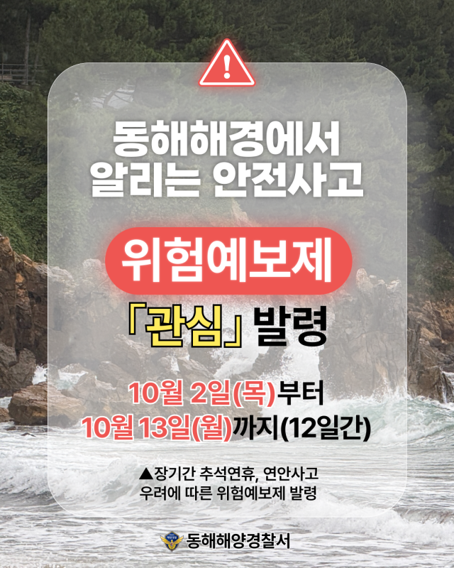 동해해양경찰서는 장기간 추석연휴 연안해역 안전관리를 위해 안전사고 위험예보제 ‘관심’ 단계를 2일부터 13일까지 12일간 발령한다.