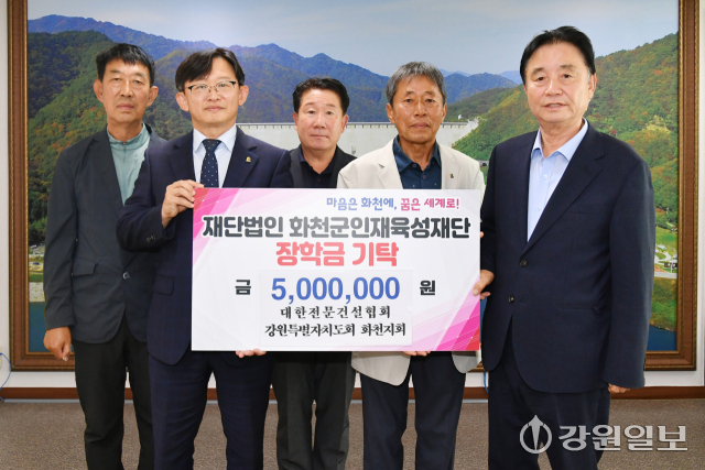 대한전문건설협회 강원특별자치도회 화천지회(회장:오성진)는 1일 화천군을 방문해 장학금 500만원을 최문순 군수(화천군 인재육성재단 이사장)에게 기탁했다.