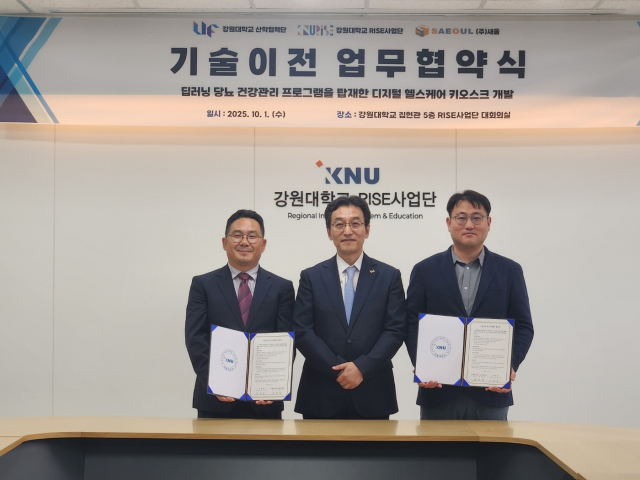 강원대 산학협력단(단장:장철성)과 ㈜새울(대표:이상도)이 1일 춘천캠퍼스 집현관 대회의실에서 ‘딥러닝 당뇨 건강관리 프로그램을 탑재한 디지털 헬스케어 키오스크 개발’ 기술이전 협약을 체결했다.