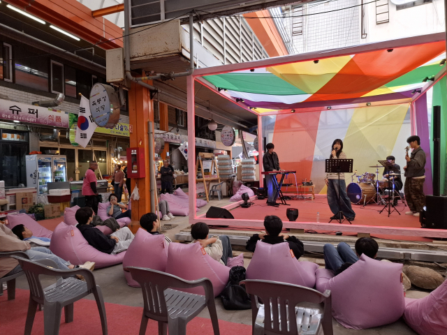 시장 중앙의 큐브스테이지에서는 밴드 라이브 공연과 마술쇼가 열리고, 빈 상가를 활용한 핑크로드살롱에서는 지역 작가들이 협업해 만든 공예품, 디자인 제품이 전시·판매된다.