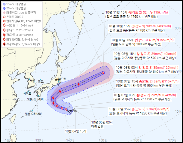 태풍은 따듯한 일본 남부 해안을 따라 이동하면서 점차 세력을 키워 오는 8일 오전엔 강도 3이 될 전망이다.