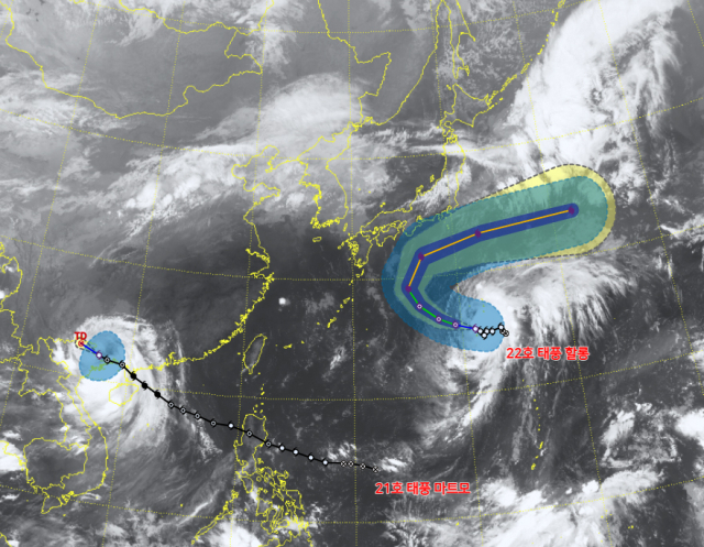 ◇제22호 태풍 '할룽'과 제21호 태풍 '마트모' 예상 진로. [기상청 제공]
