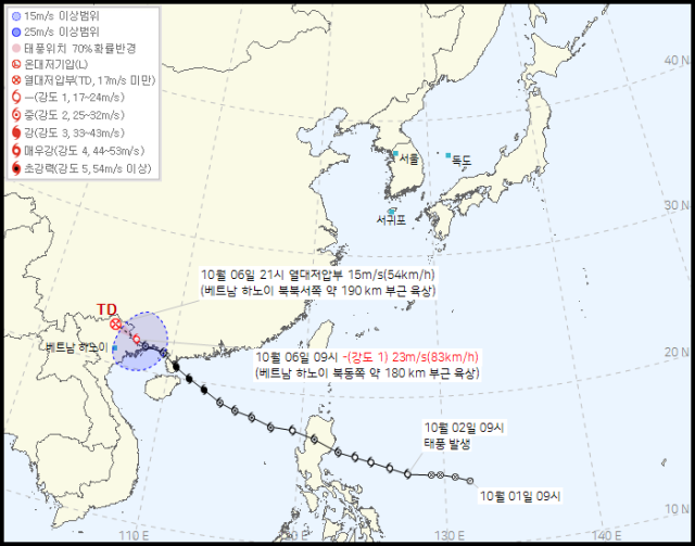 당초 제주도와 일본 남부 큐슈 사이 해안을 관통할 가능성도 배제할 수 없었으나, 7일 밤과 모레 새벽 사이 진로를 급격하게 틀어 태평양으로 향할 것으로 보여 우리나라에는 직접 영향을 끼칠 가능성은 희박하다.