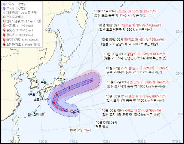태풍은 따듯한 일본 남부 해안을 따라 이동하면서 점차 세력을 키워 오는 8일 오전엔 강도 3이 될 전망이다.